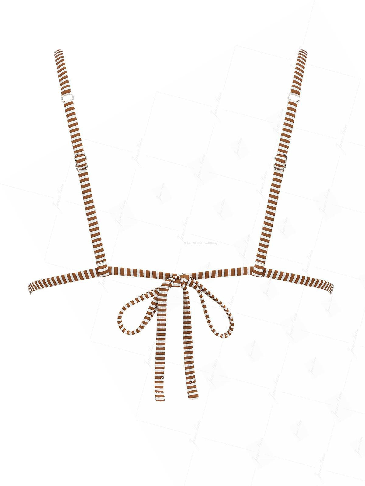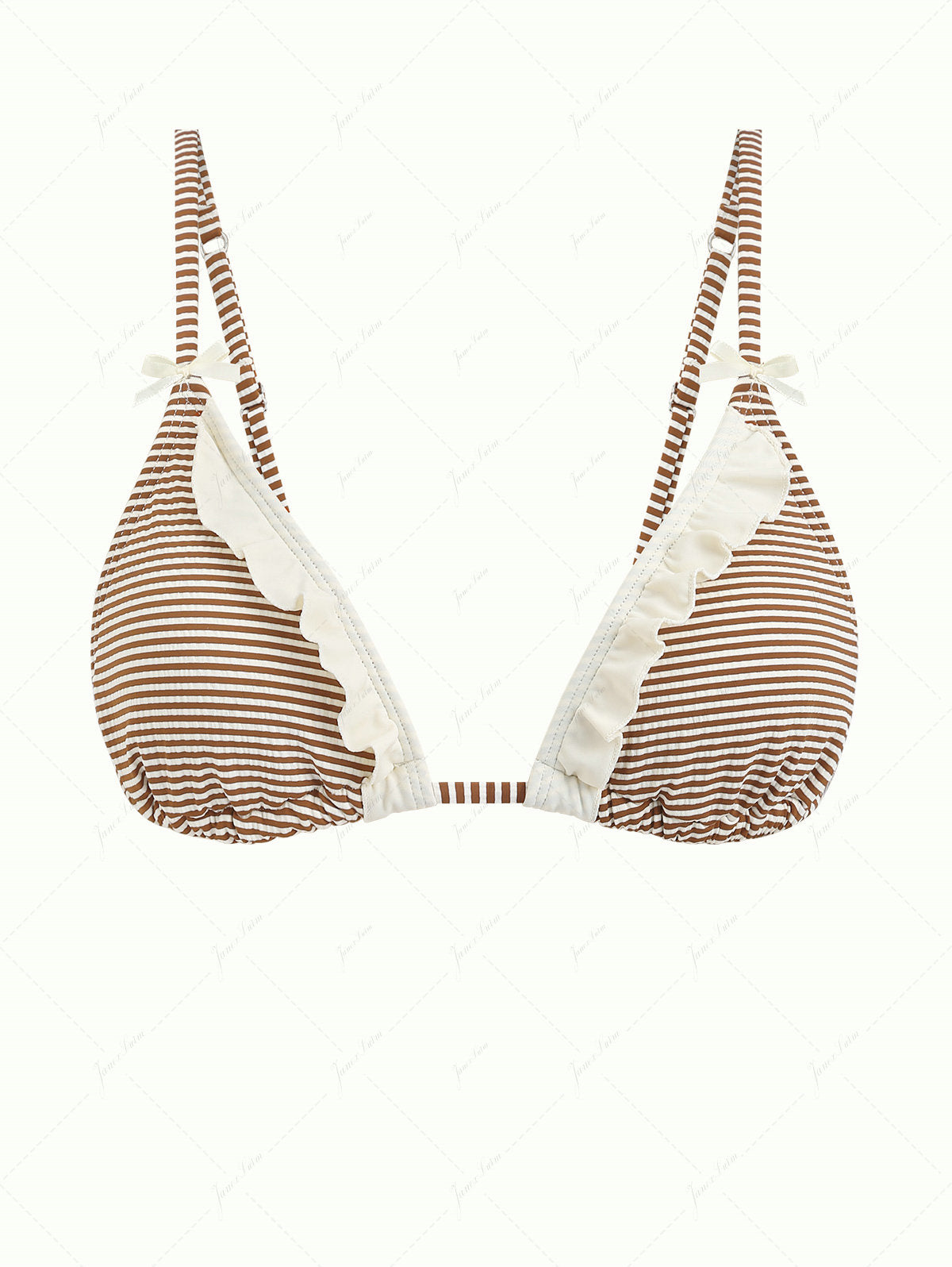 Coffee Striped Frilled Ruffles Bowknot Triangle Bikini Top