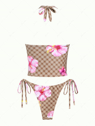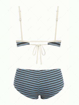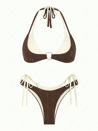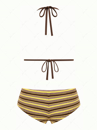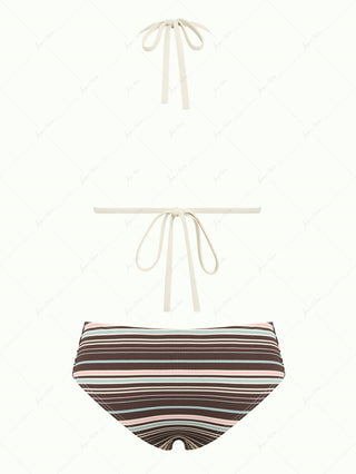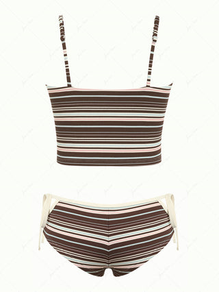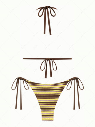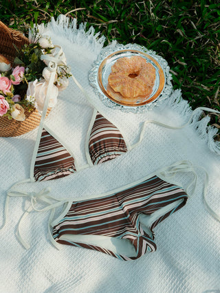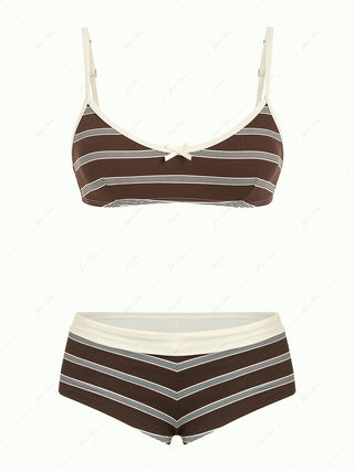 Deep Coffee Ribbed Striped Contrast Binding Triangle Top & Cheeky Boyshorts Bikini Set