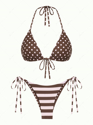 Pink Striped Polka Dot Print Reversible Triangle Top & Cheeky Brazilian Bottom Bikini Set