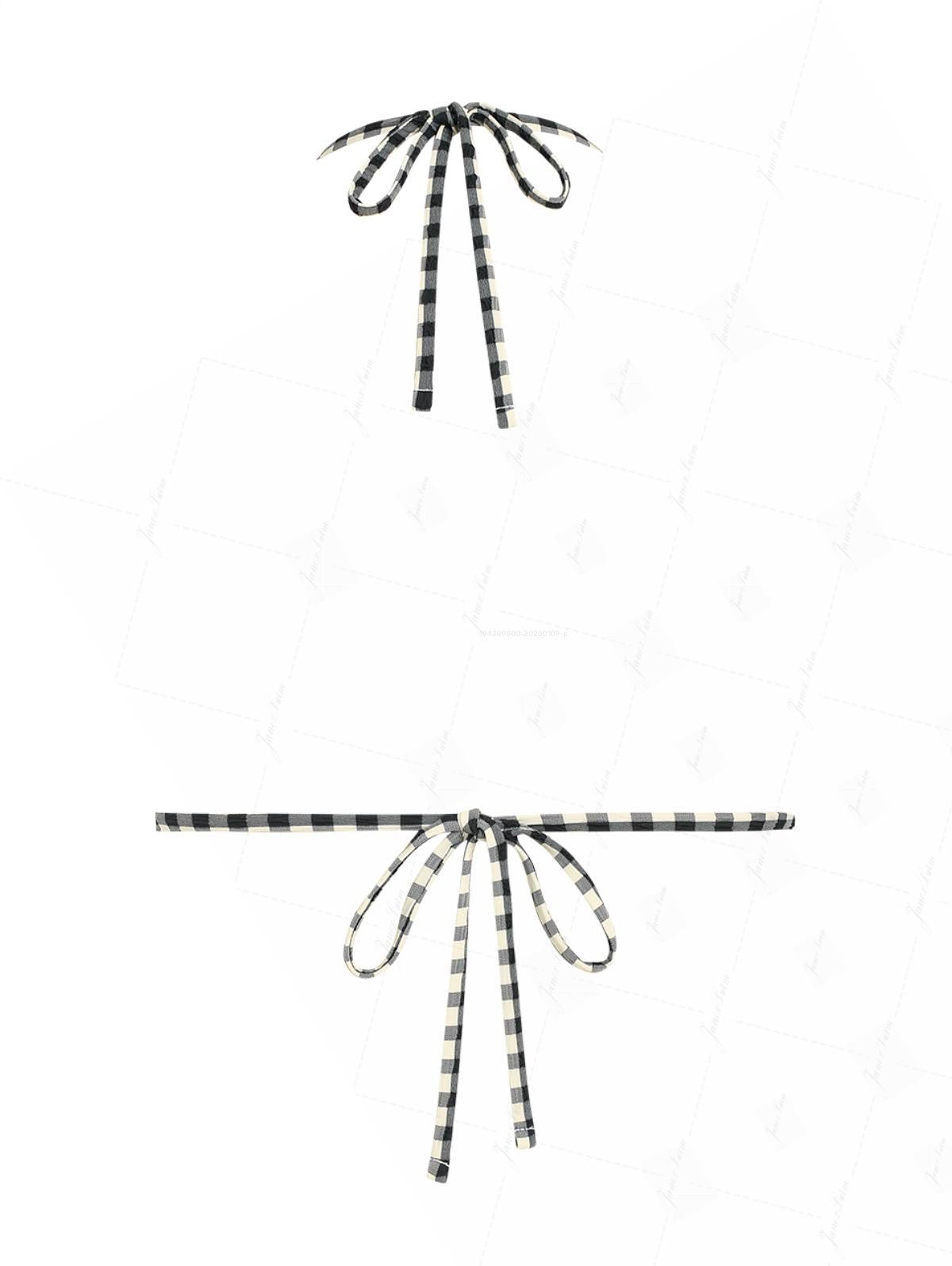 Black Plaid Picot Bowknot Halter Triangle Bikini Top