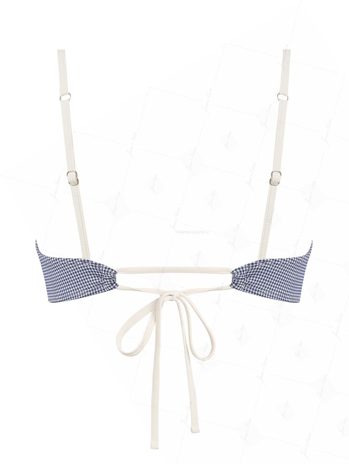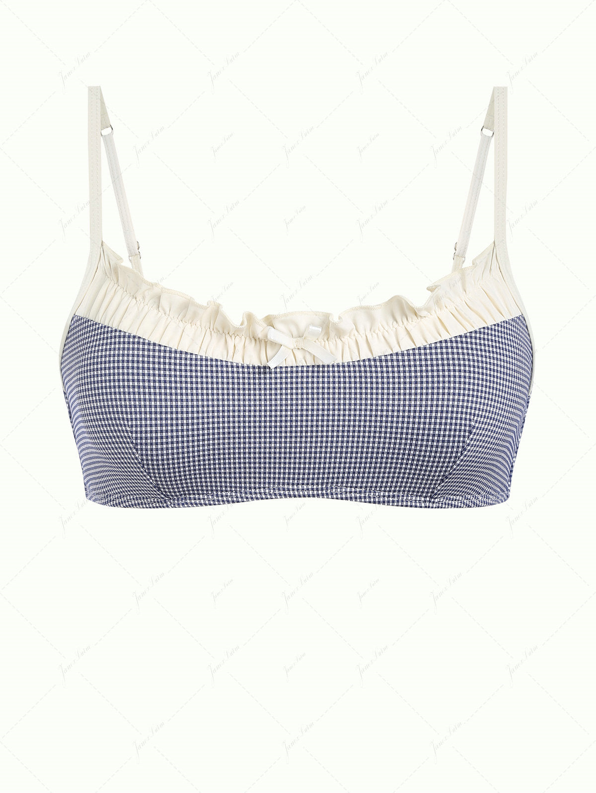 Deep Blue Vintage Plaid Spliced Ruched Bowknot Bikini Top