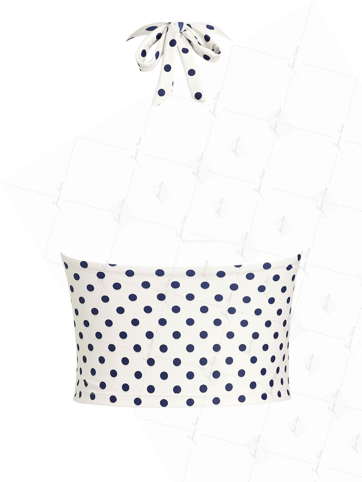 Crystal Cream Vintage Polka Dot Plunging Neck Halter Tankini Top