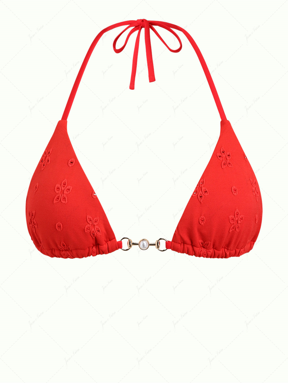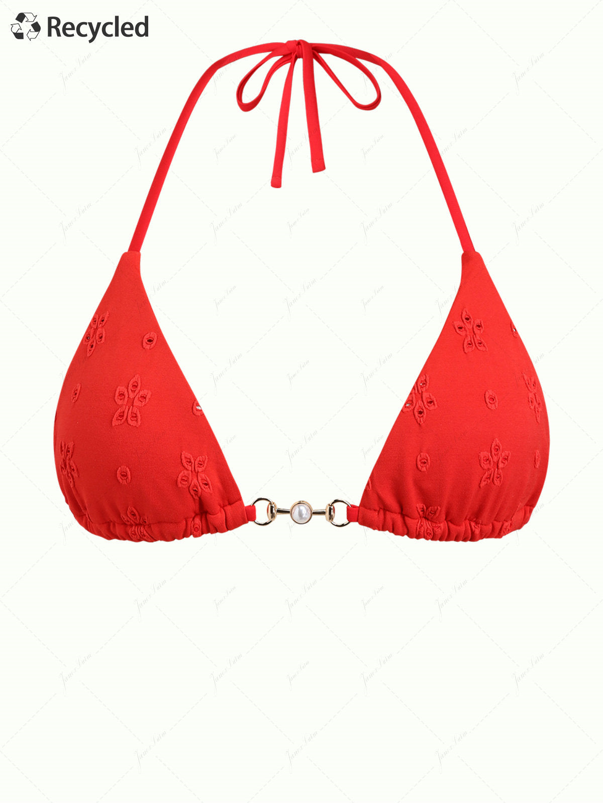 Red Recycled Fabric Jacquard Faux Pearl Halter Triangle Bikini Top