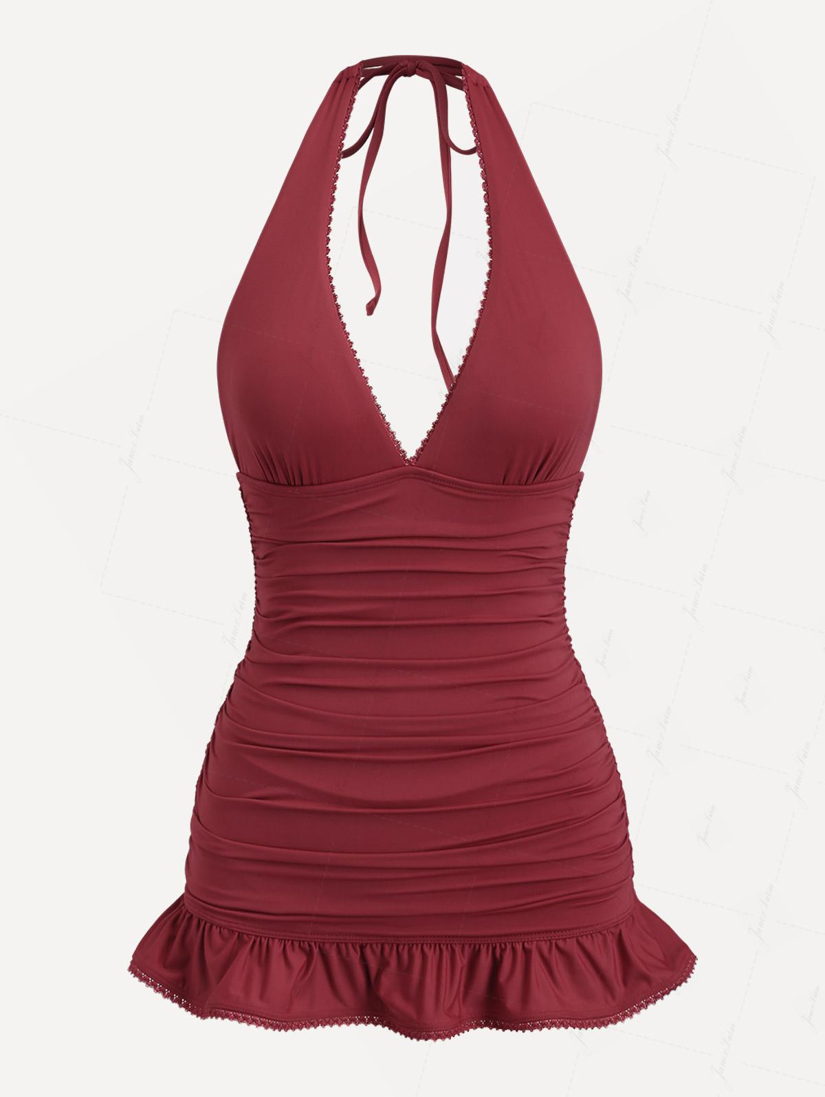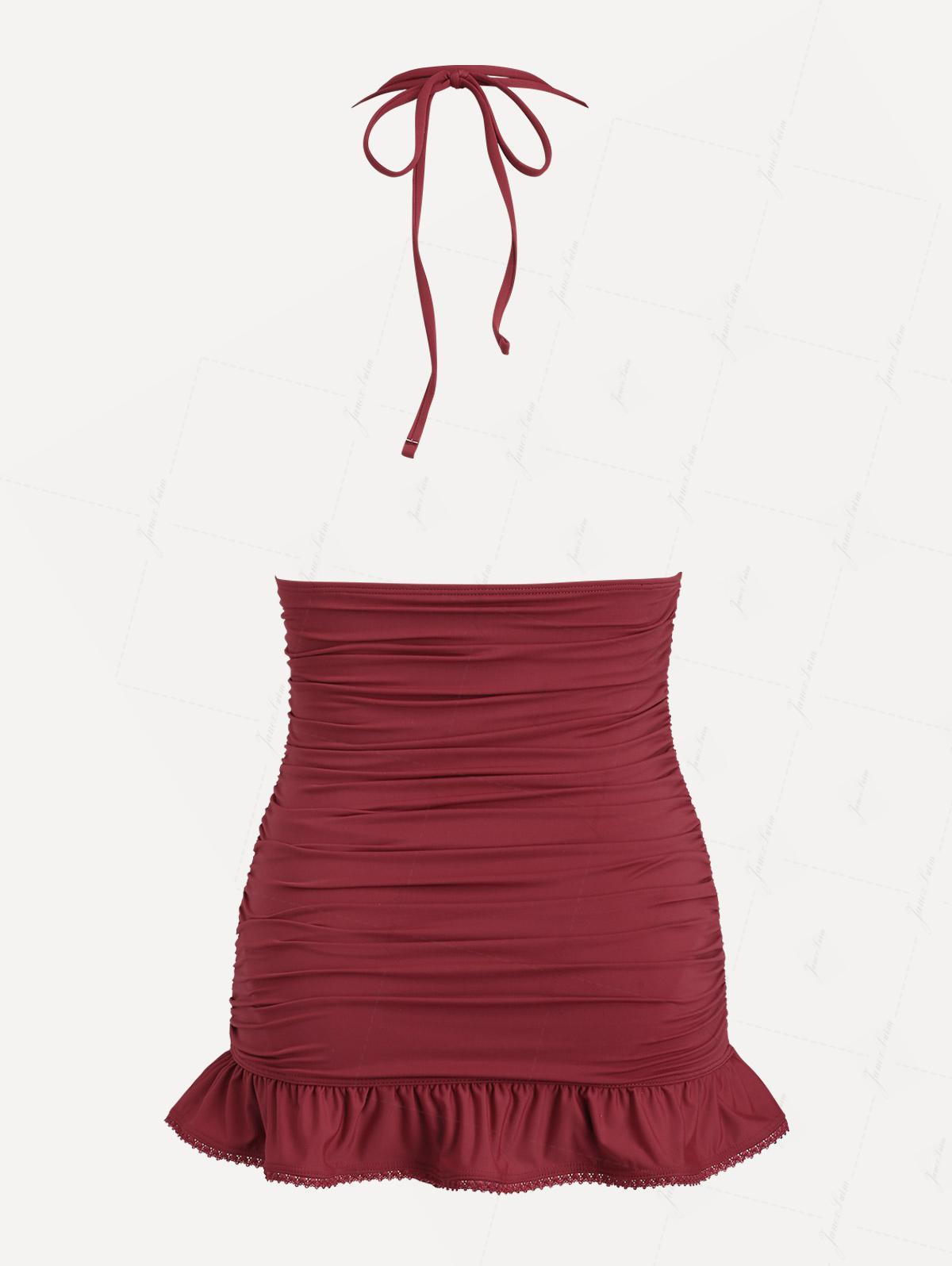 Red Wine Vintage Ruched Lace Peplum Hem Halter Tied One-piece Swimsuit