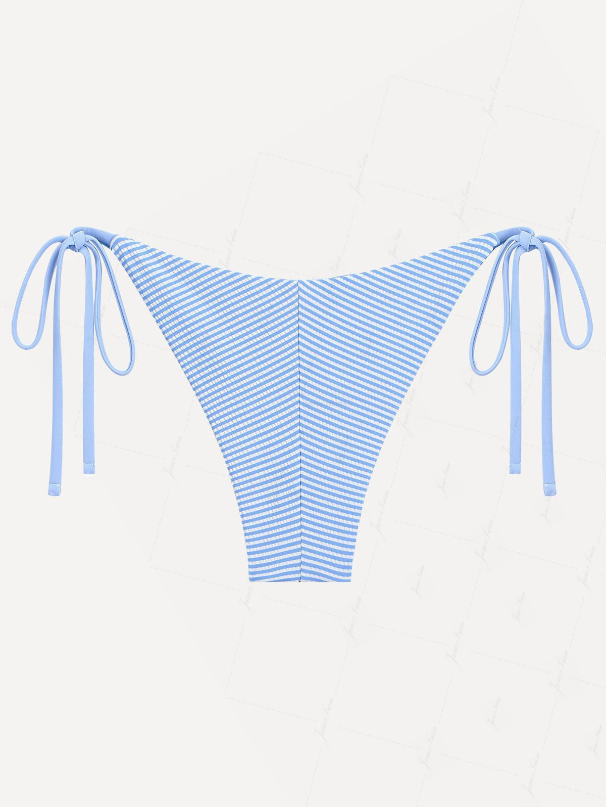 Light Blue Striped Contrast Lace Bowknot Tie Side Brazilian Bikini Bottom
