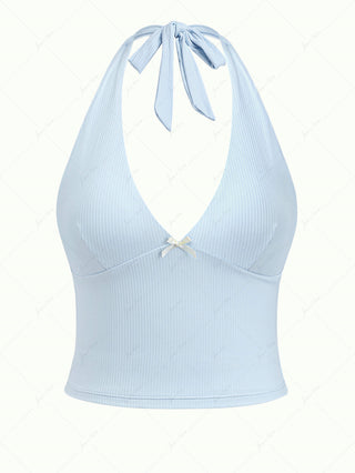 Deep Blue Denim Lace Plunging Neck Halter Tied Tankini Top