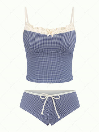 Deep Blue Vintage Plaid Spliced Ruffles Tank Top & Cheeky Boyshorts Tankini Set