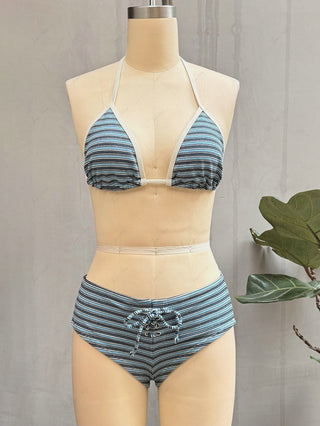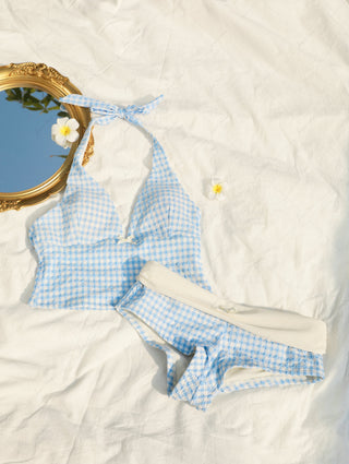 Light Blue Grid Textured Plunging Neck Halter Foldover Cheeky Boyshorts Tankini Set