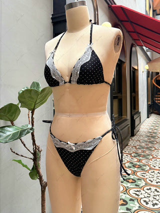 Black Pin Dot Jacquard Fabric Triangle Push Up Top & Cheeky Boyshort Bikini Set