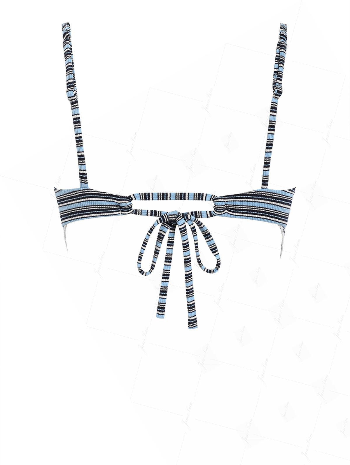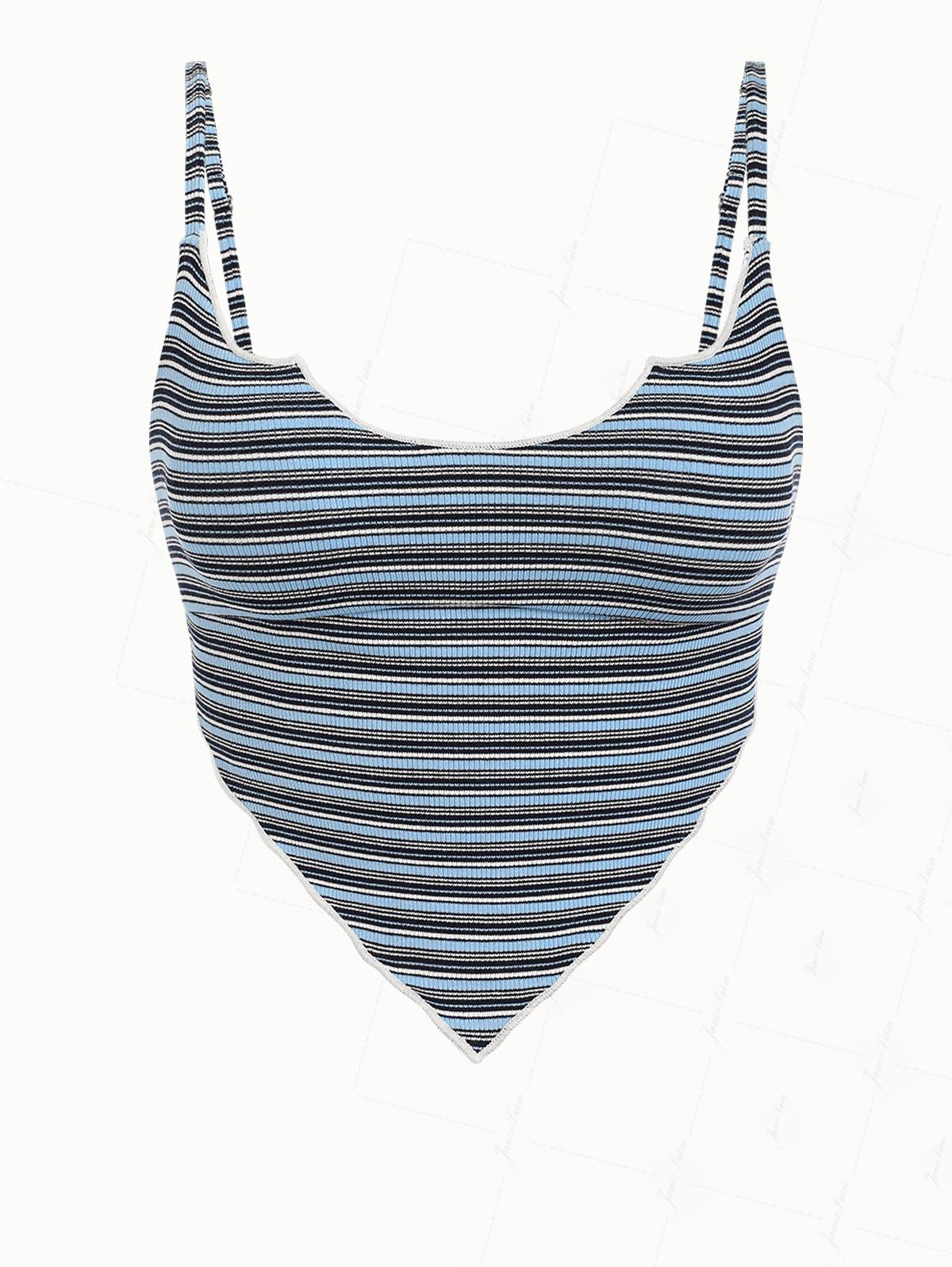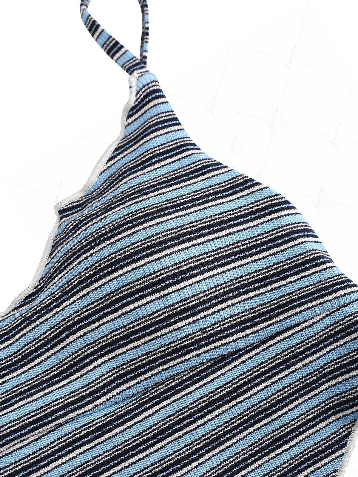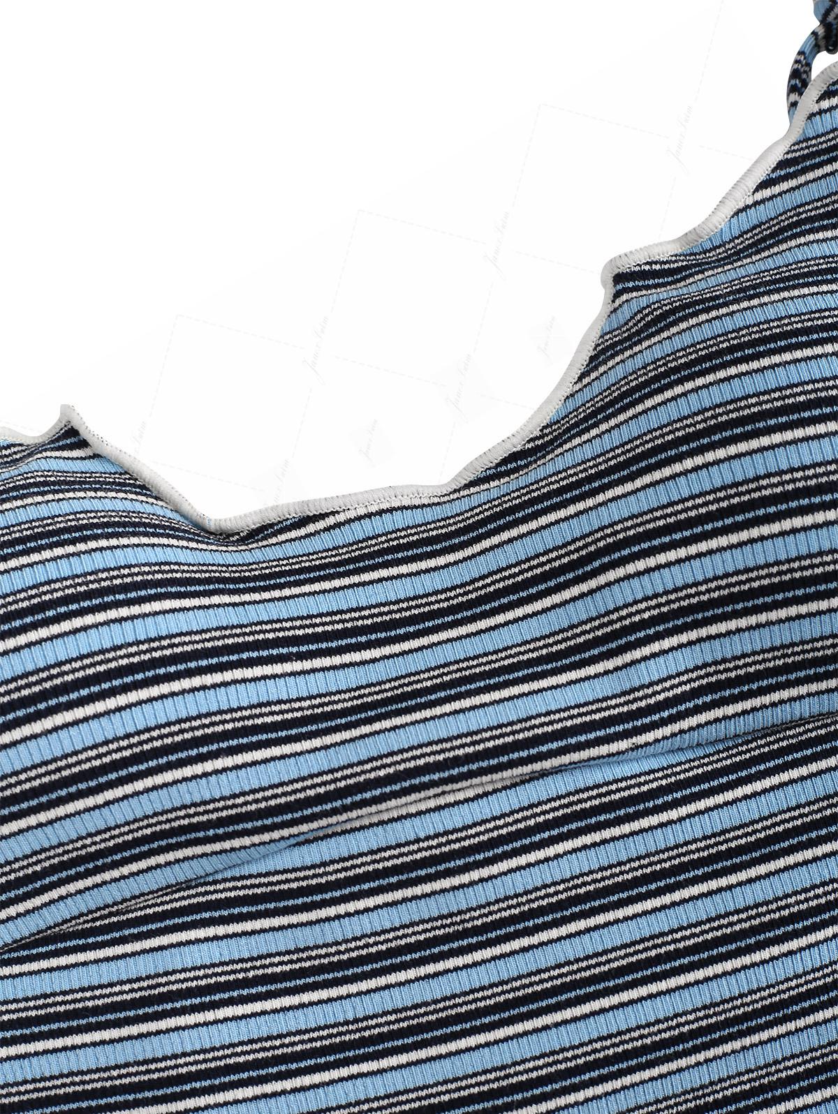 Blue Ribbed Knit Striped Hanky Hem Cinched Tankini Top