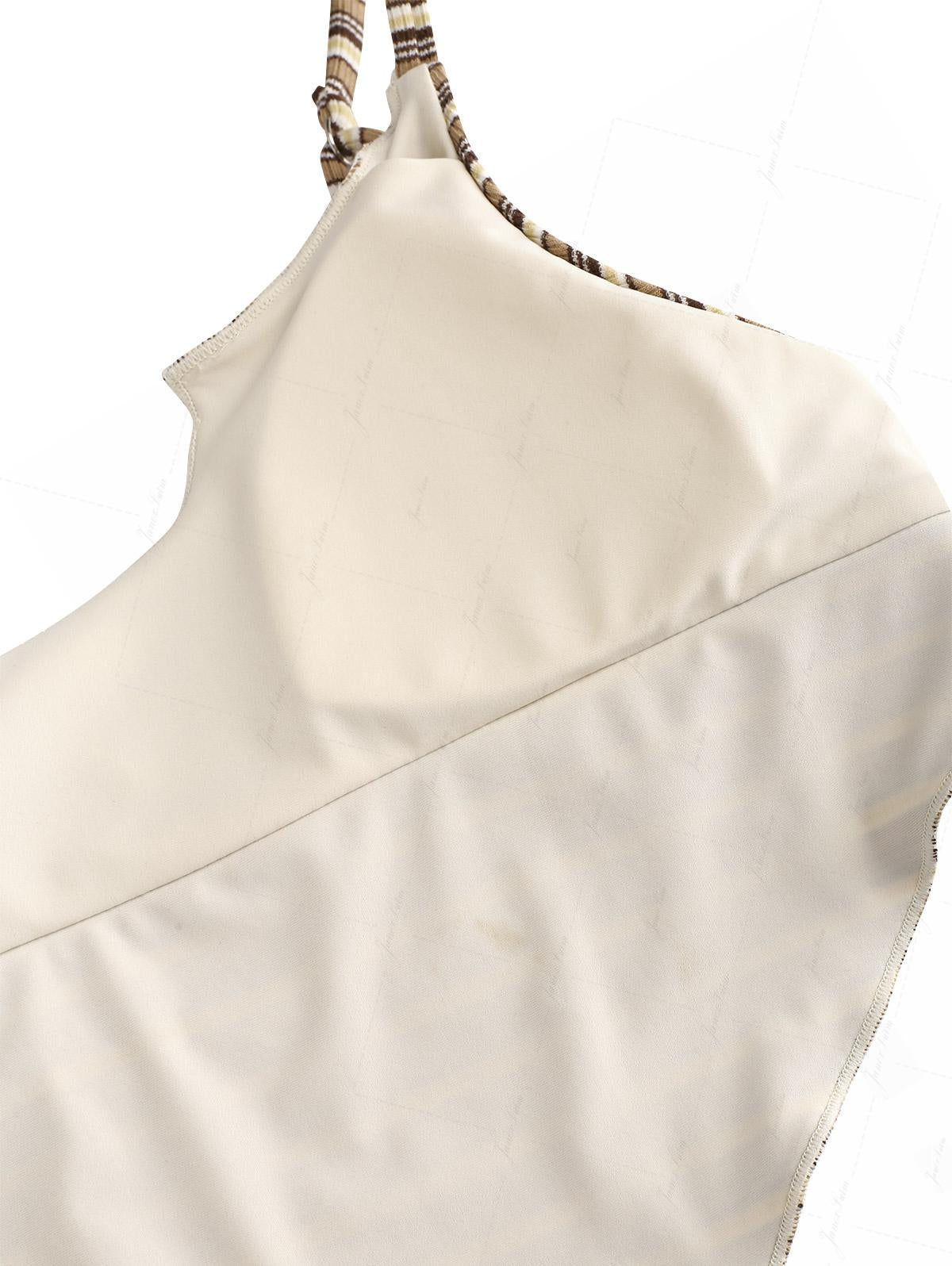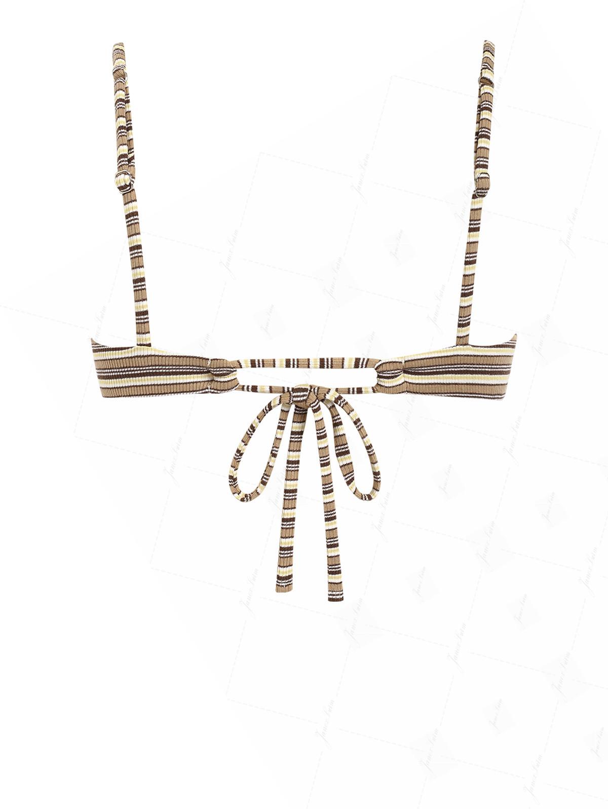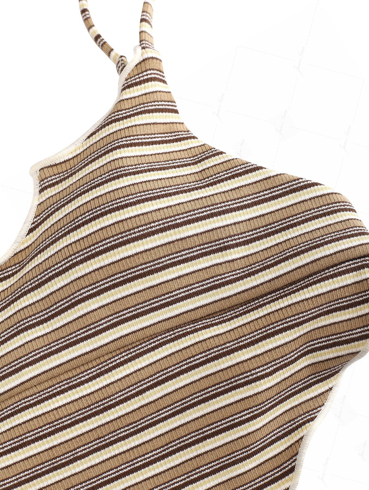 Brown Ribbed Knit Striped Hanky Hem Cinched Tankini Top