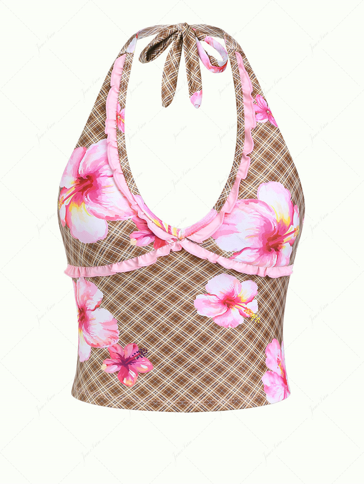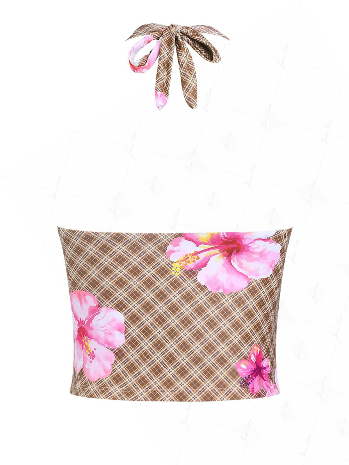Coffee Plaid Floral Hibiscus Print Frilled Ruffles Plunging Neck Halter Tied Tankini Top