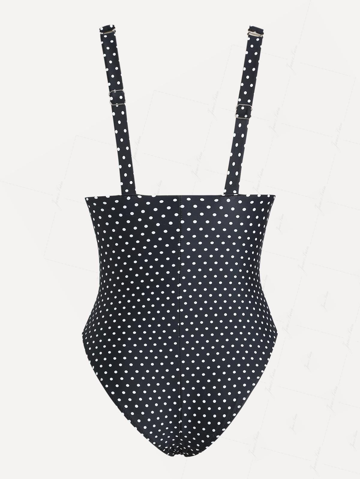 Black Polka Dot Print Ruched Plunging Neck One-piece Swimsuit