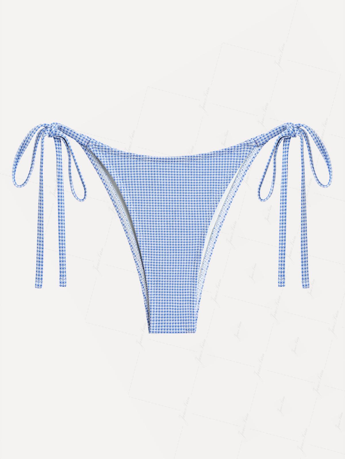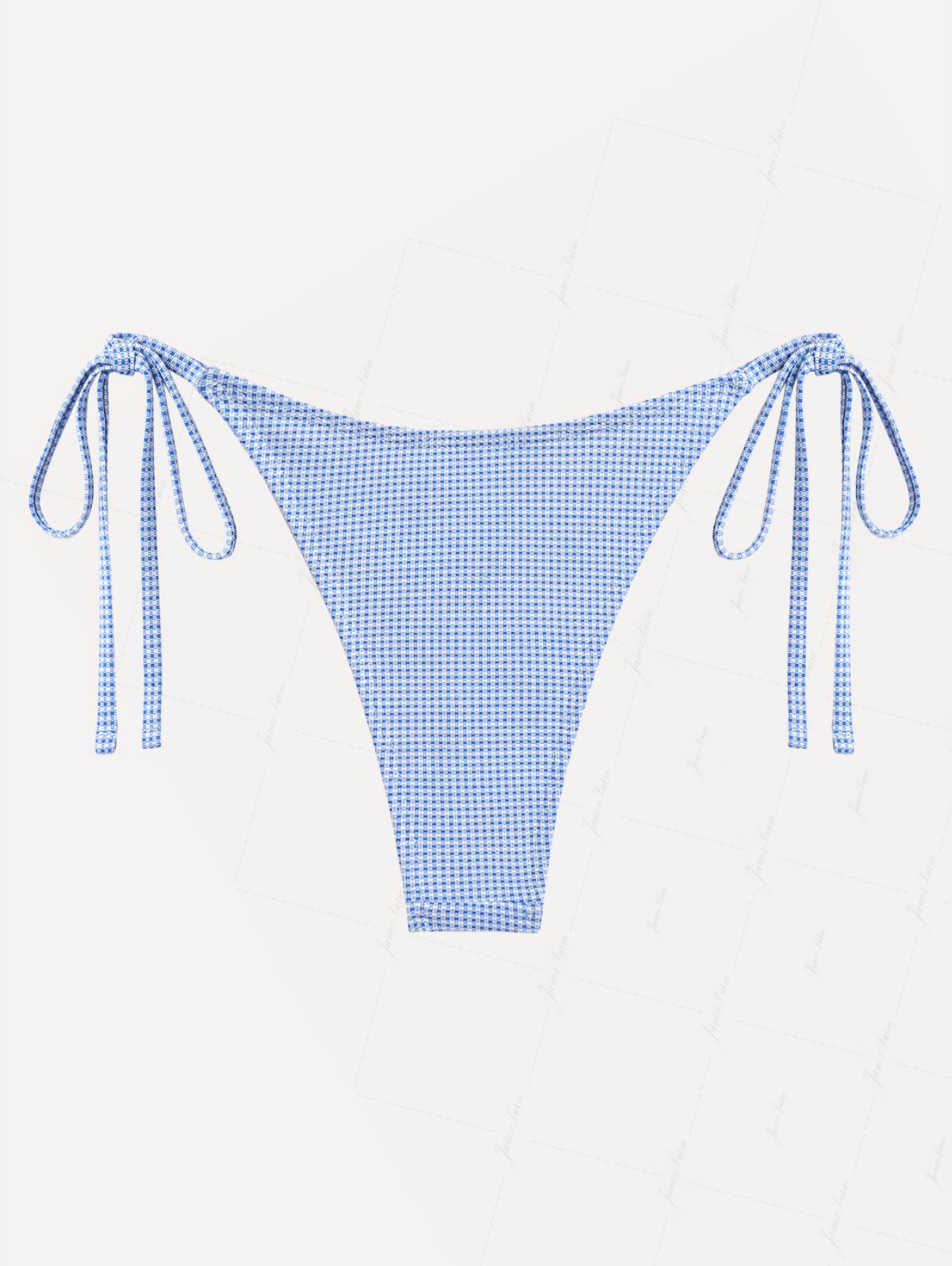 Blue Knitted Plaid Fabric Tie Side String Bikini Bottom