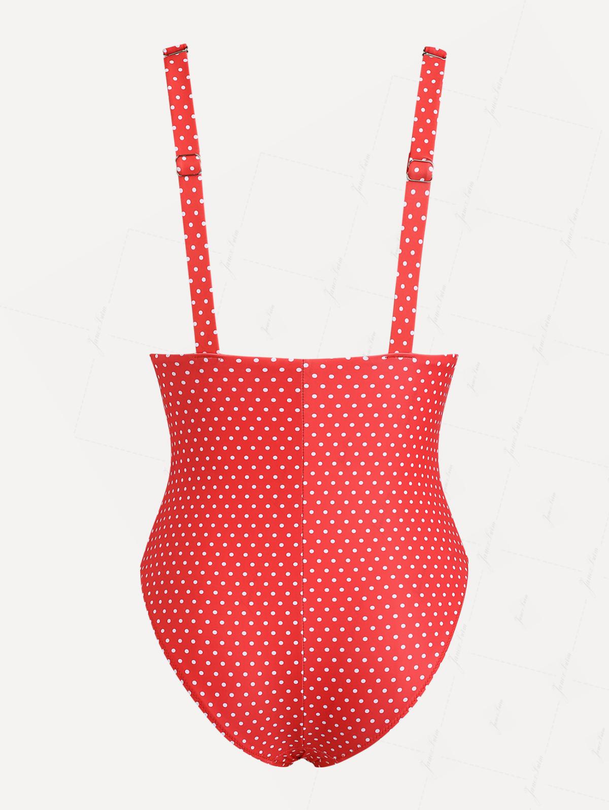 Red Polka Dot Print Vintage Ruched Plunging Neck One-piece Swimsuit