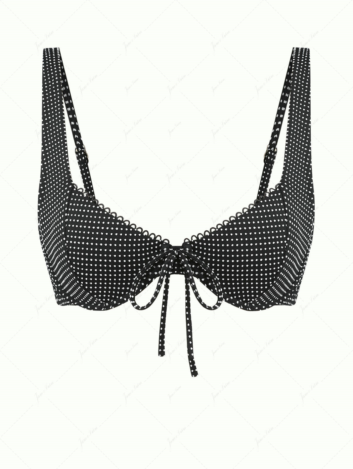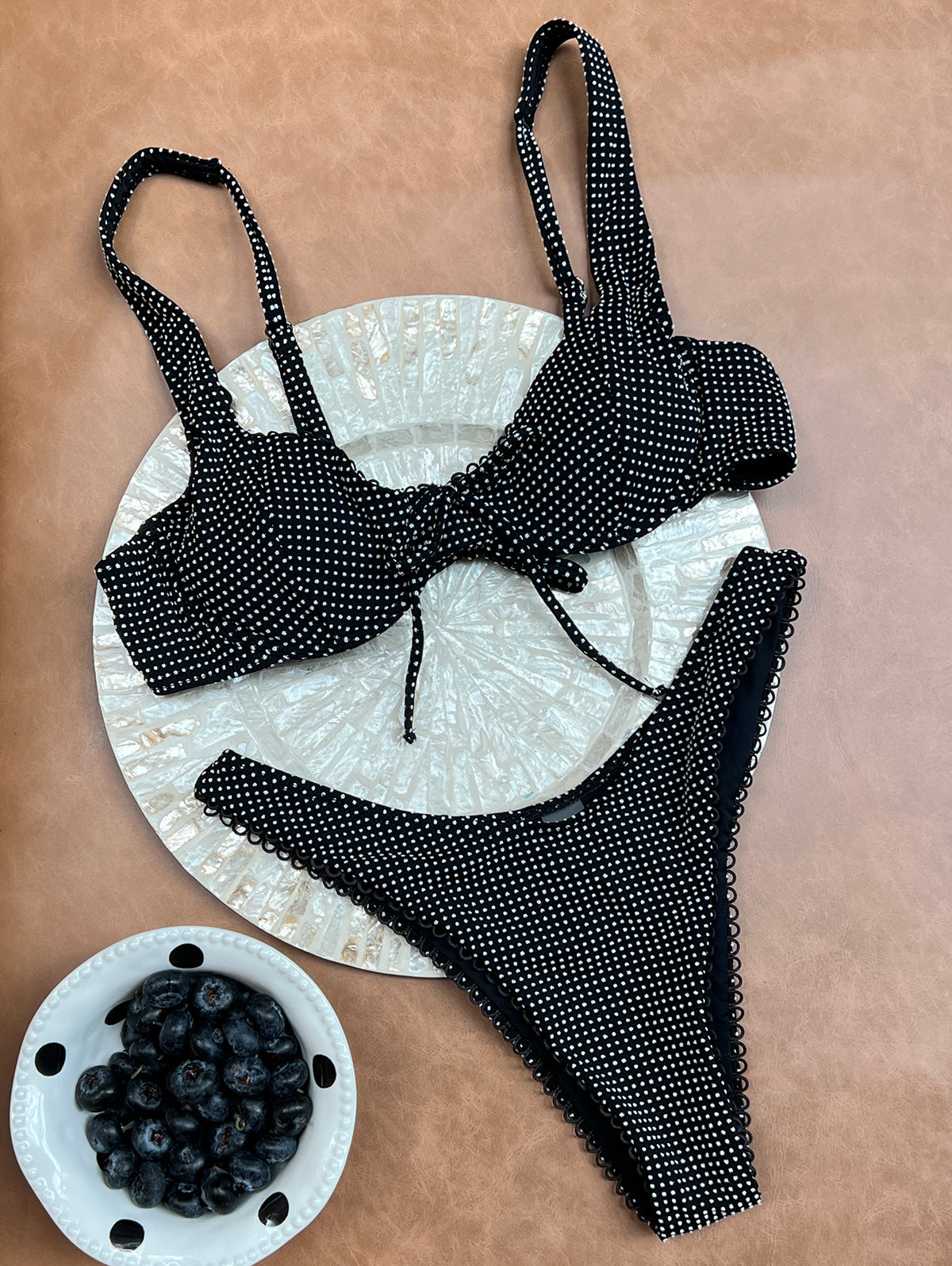 Black Pin Dot Jacquard Fabric Picot Trim Underwire Bikini Top