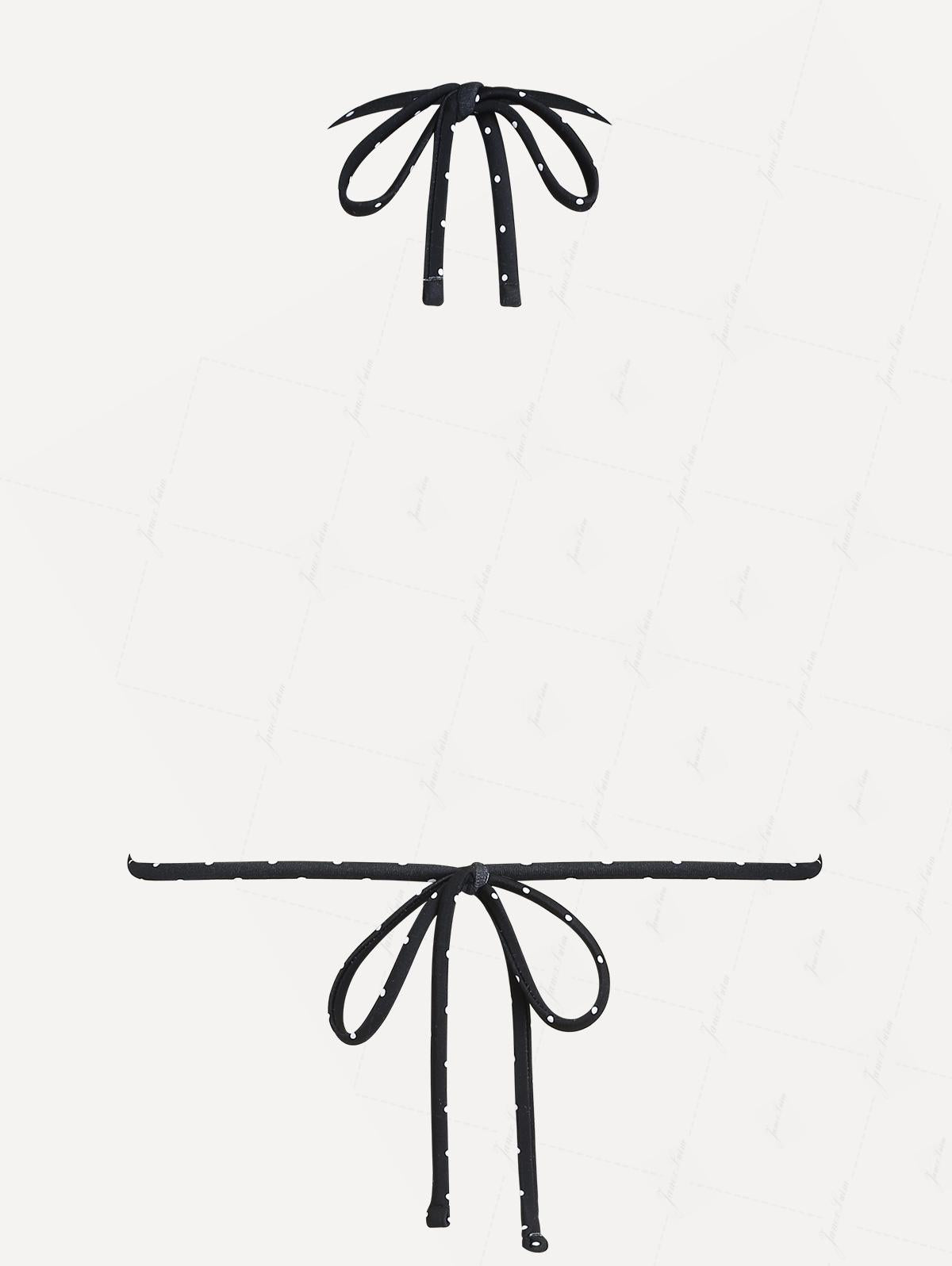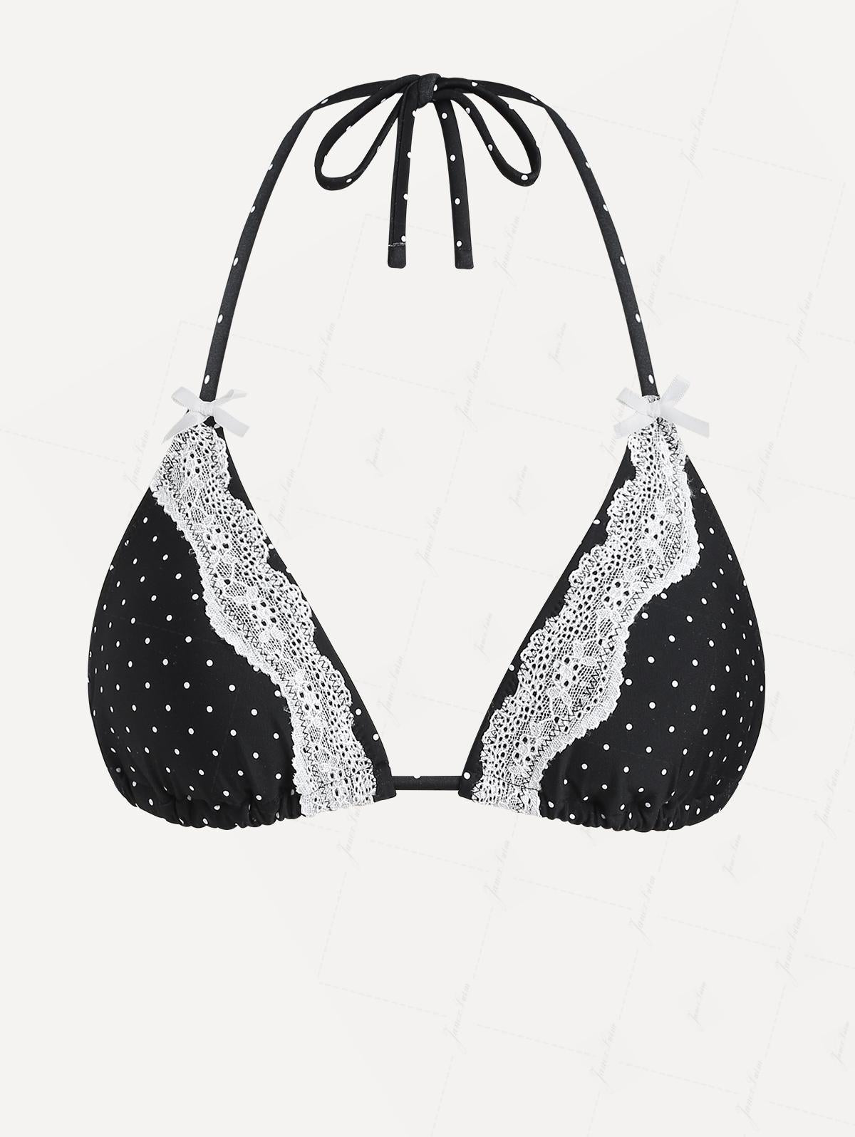 Black Polka Dot Print Lace Bowknot Halter Triangle Bikini Top