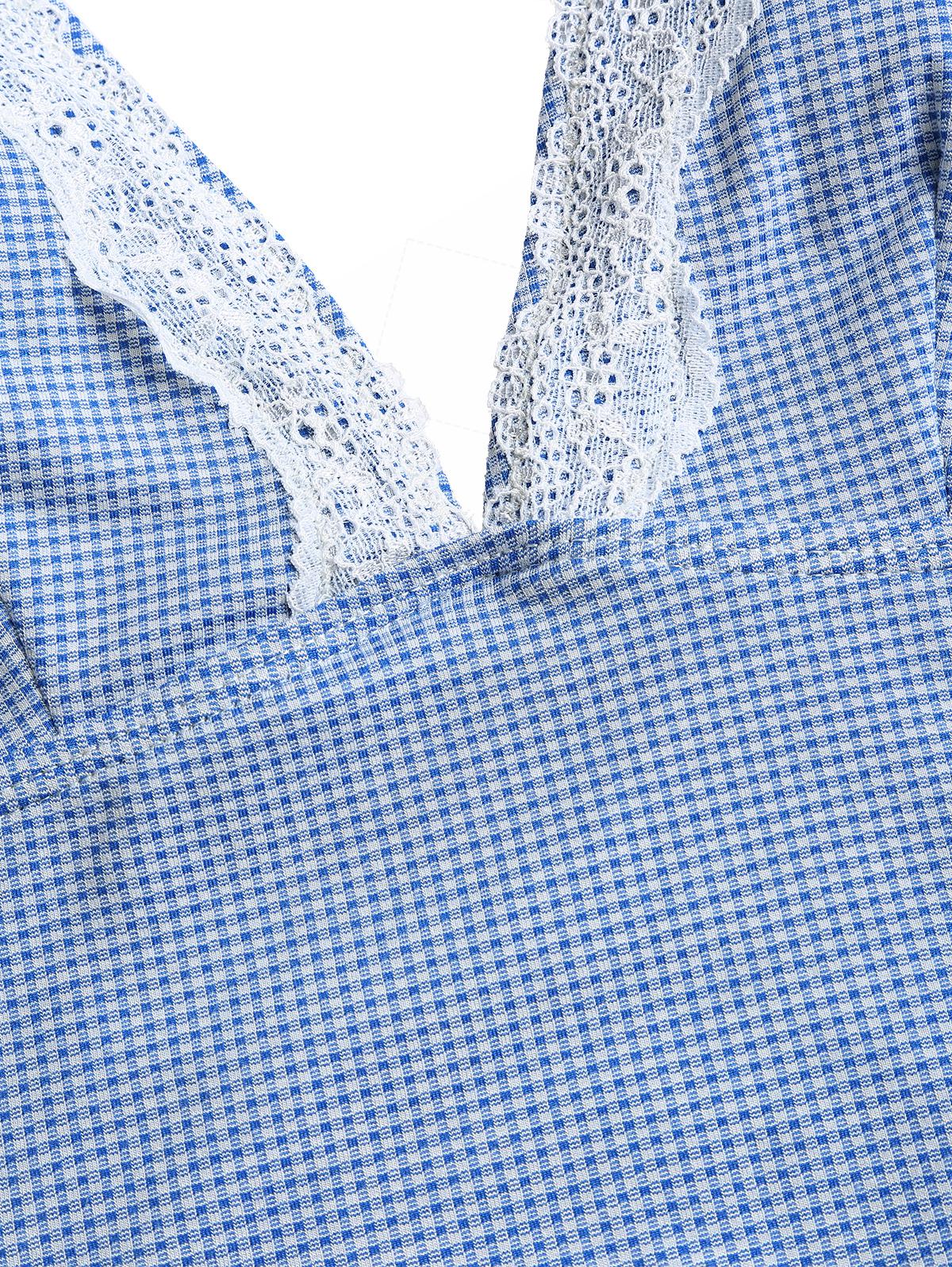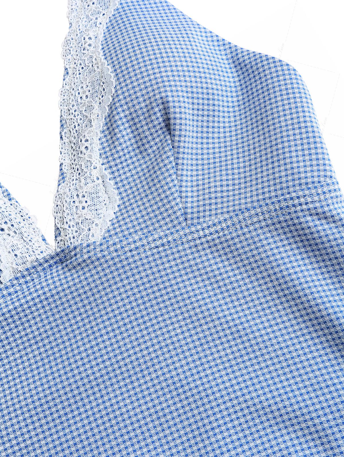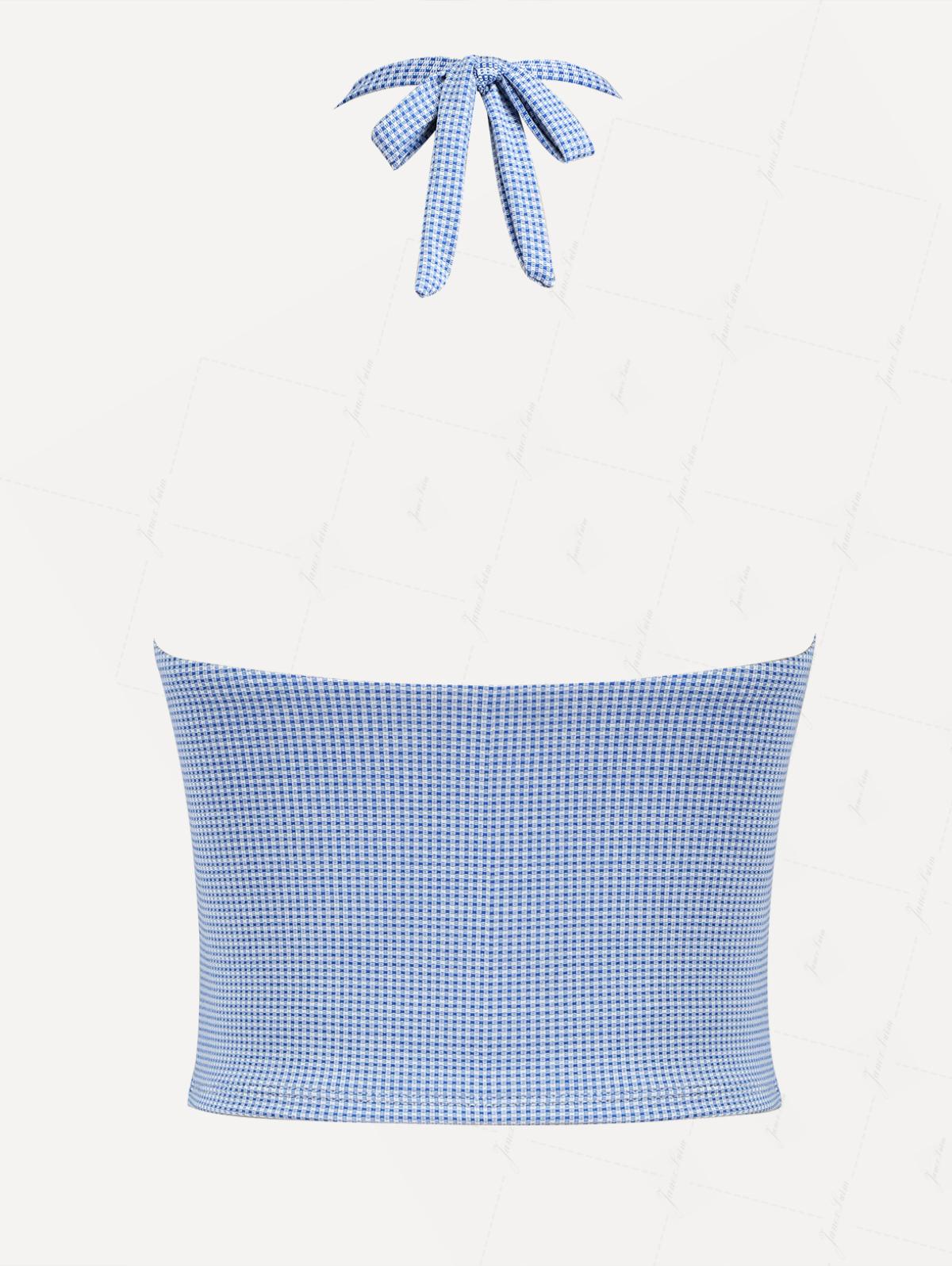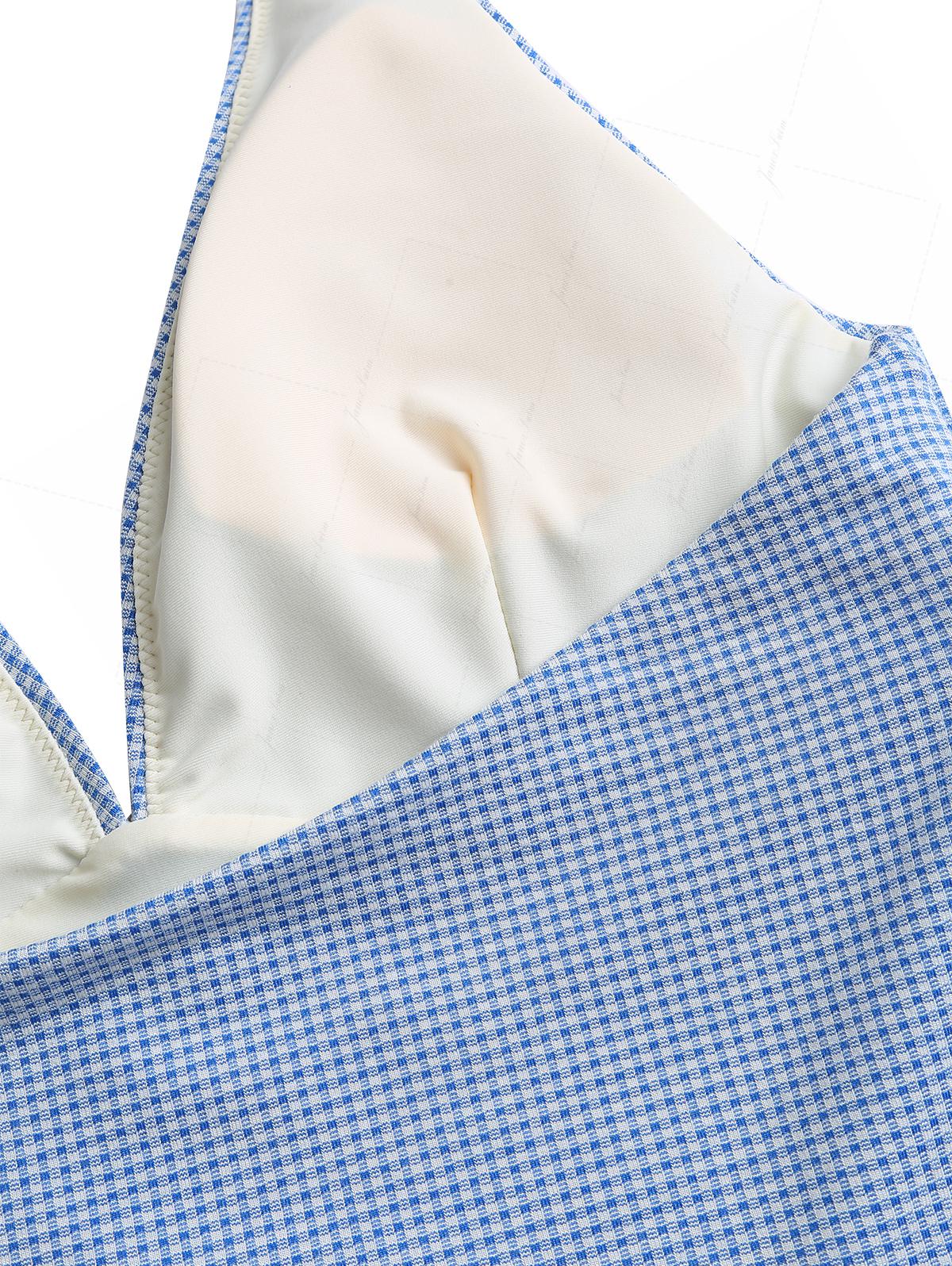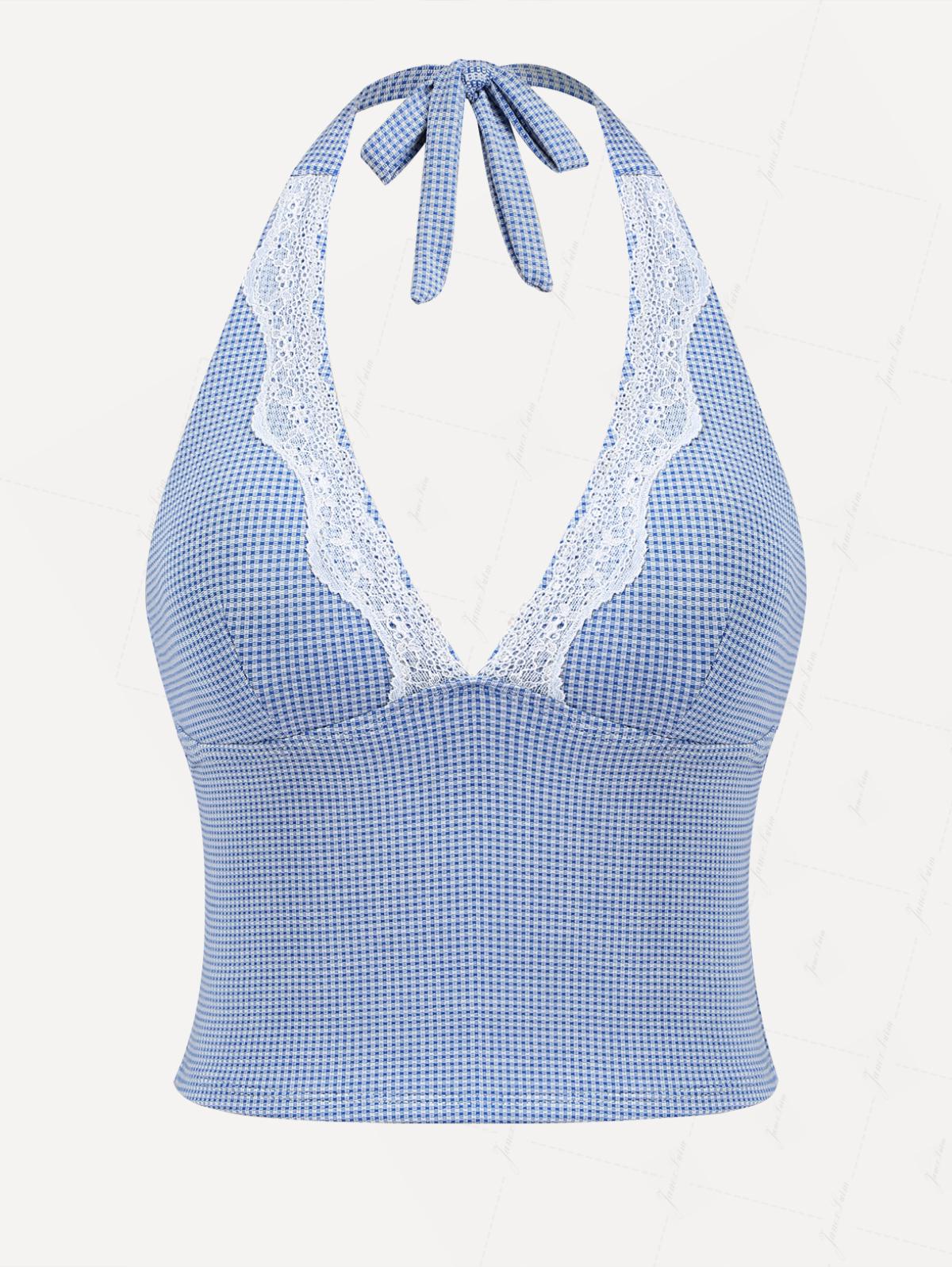 Blue Knitted Plaid Contrast Lace Plunging Neck Halter Tied Tankini Top