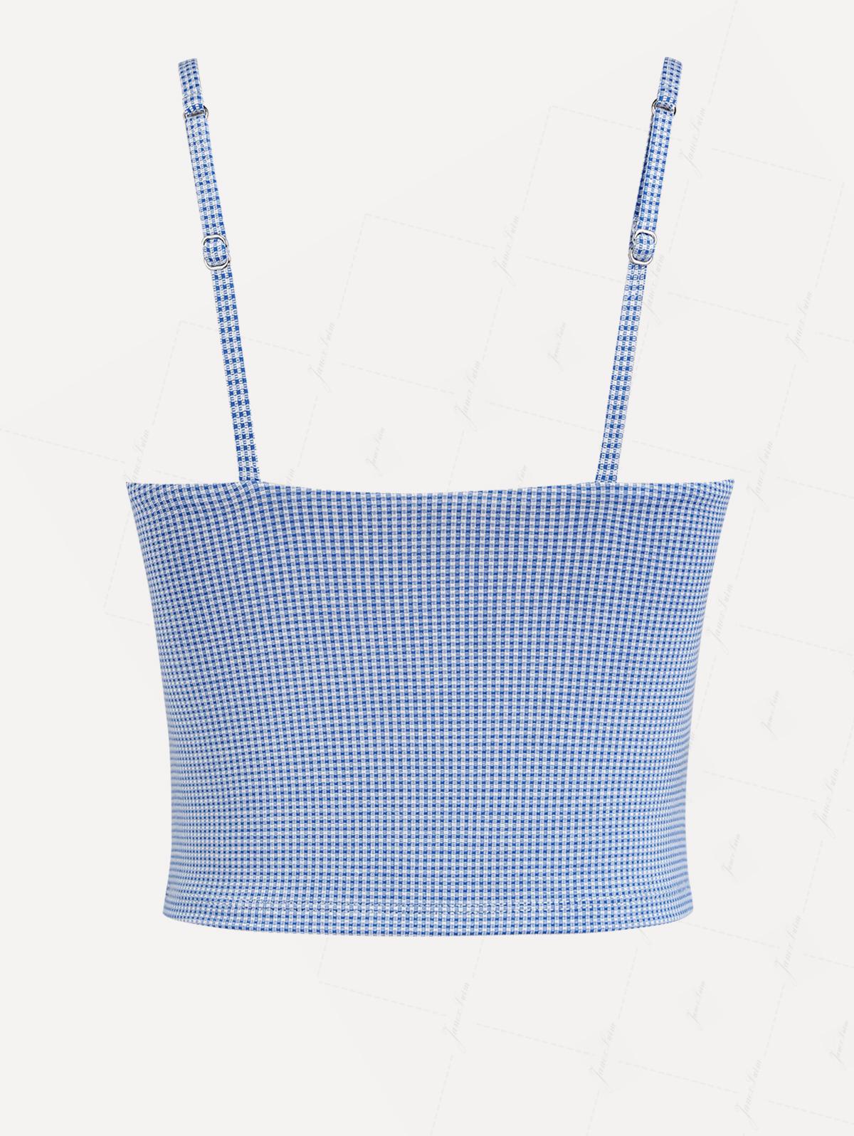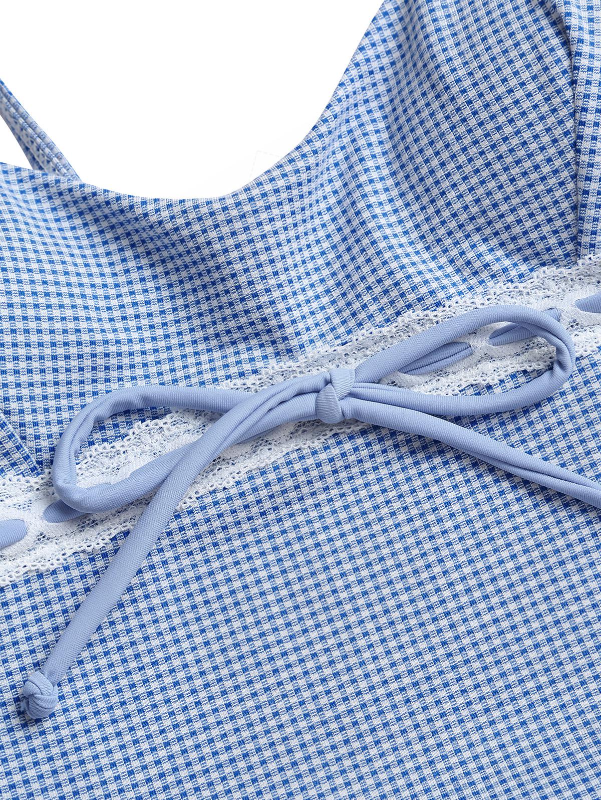 Blue Knitted Plaid Contrast Lace Trim Bowknot Cami Tankini Top